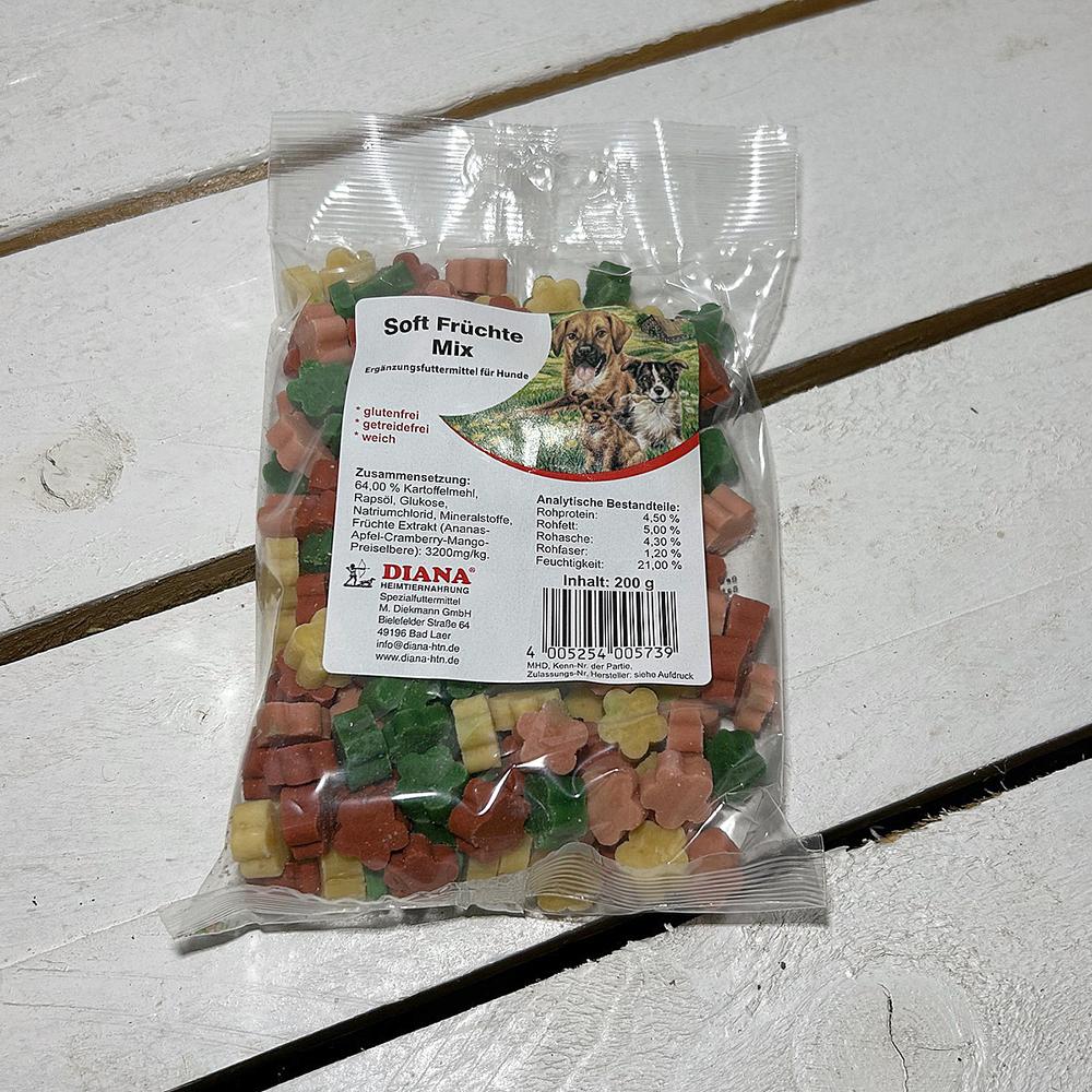 Bunte, weiche Leckerli, die Deinem Hund bestimmt prima schmecken. Der Soft Früchte Mix ist mit Früchte-Extrakt aus Ananas, Apfel, Cranberry, Mango und Preiselbeere und macht mit seinen fröhlich-bunten Farben einfach gute Laune im Leckerlibeutel.
